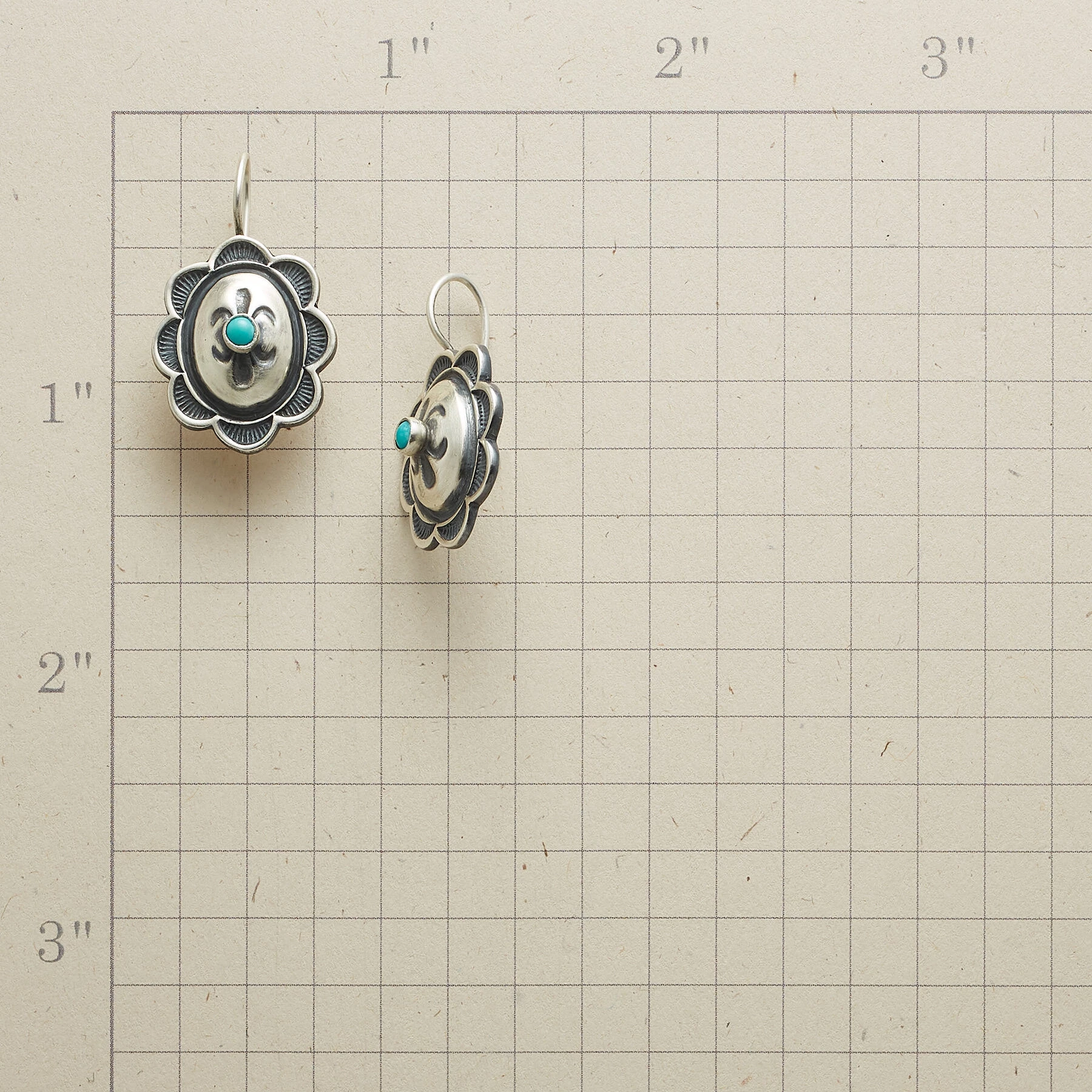 Inspired by conchos and the desert in bloom, these sterling silver earrings are centered with turquoise and edged with hand-stamped petals. Sterling French wires. Handmade in USA. Exclusive. 1-1/8″L.