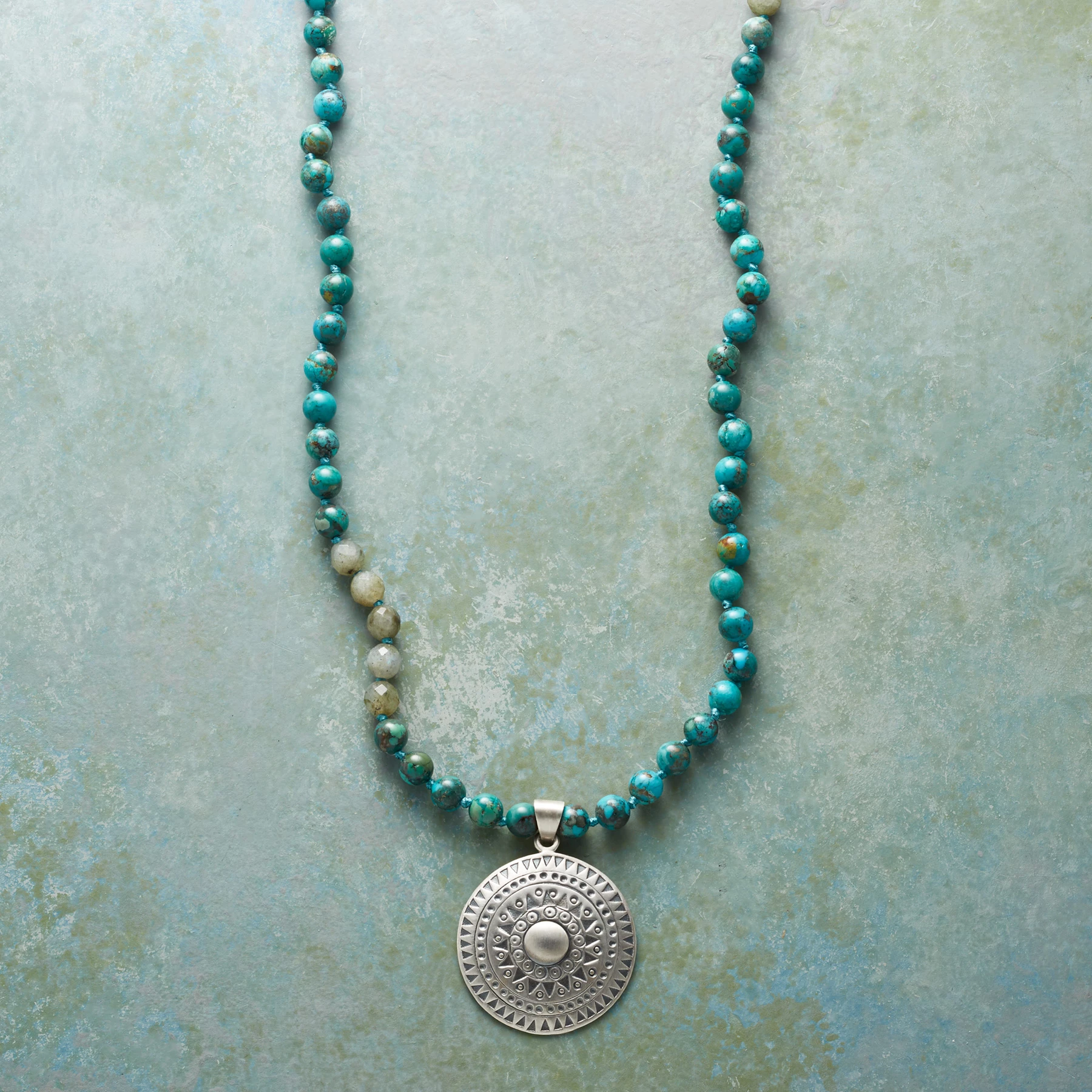 A stream of smooth stabilized turquoise and faceted labradorite flows, cool and blue, toward a radiant disc of stamped sterling silver. A meditation mala, hand knotted on silk. Made in USA. Exclusive. 32″L, 1-1/2″ drop.