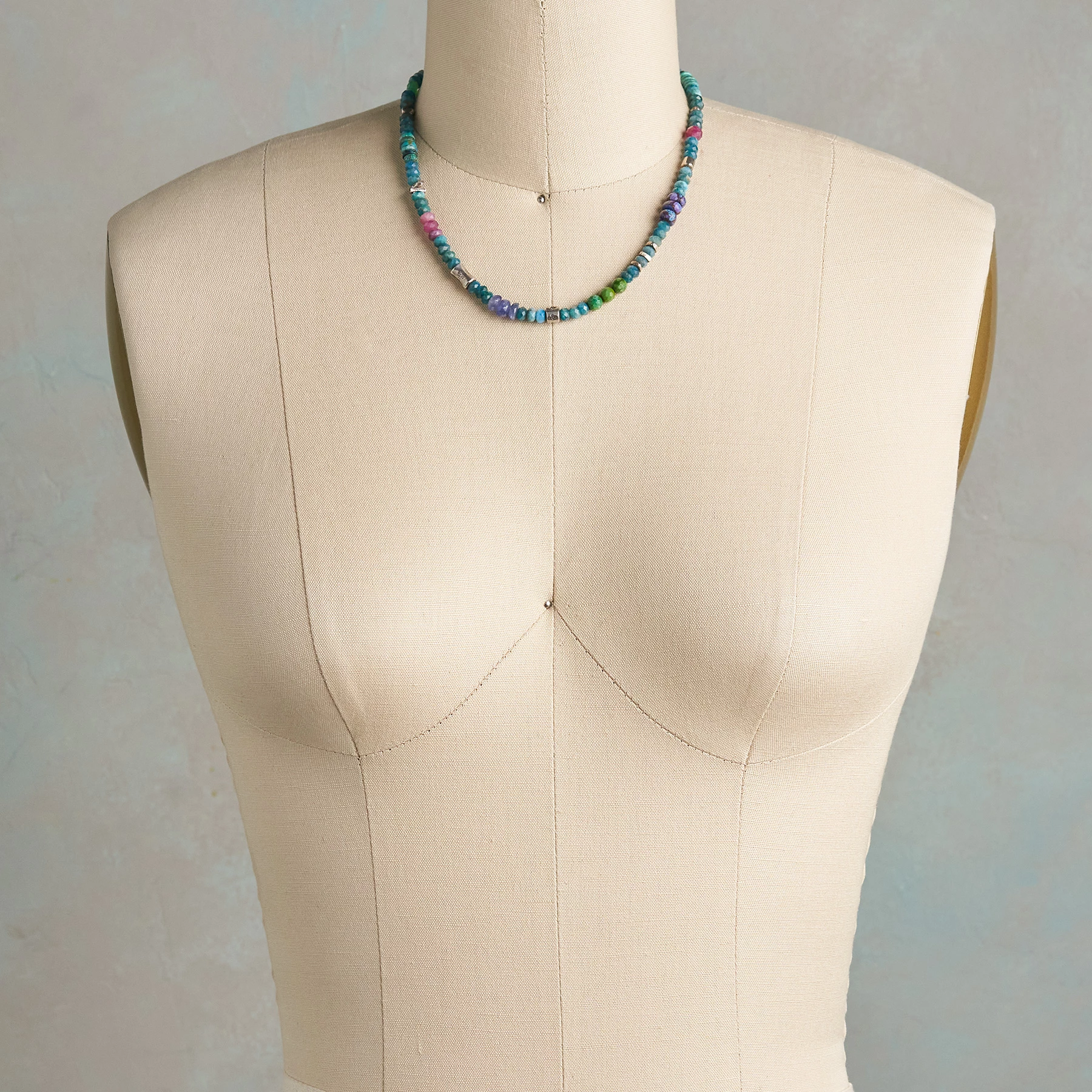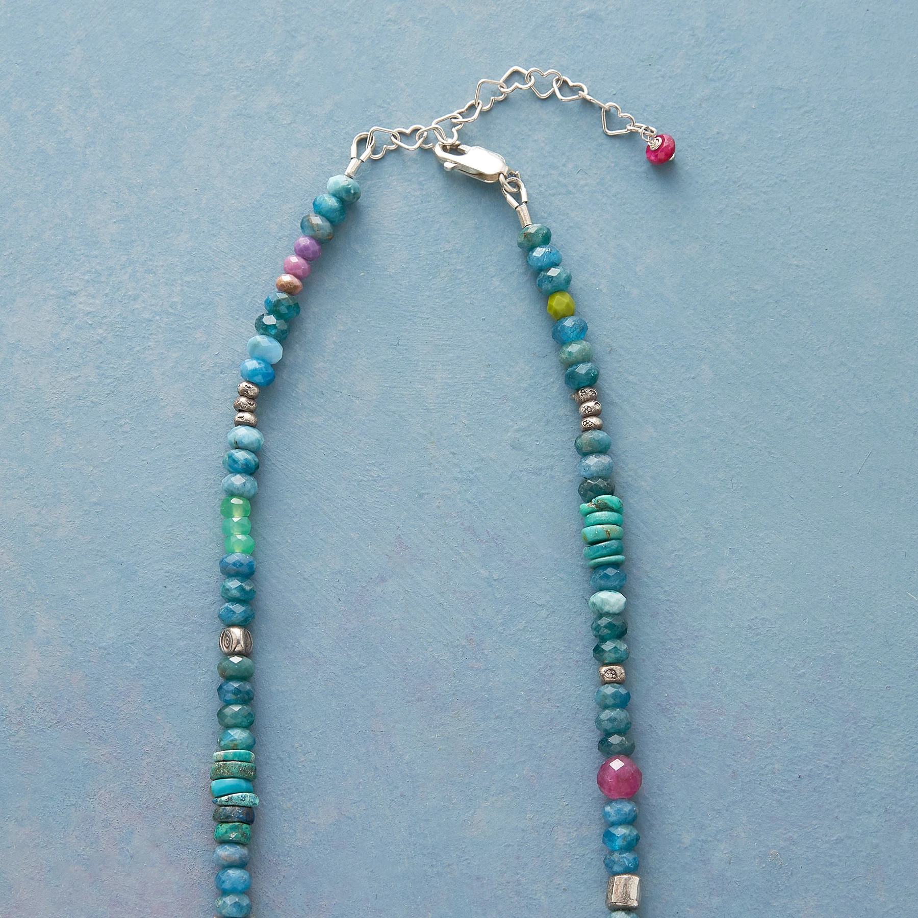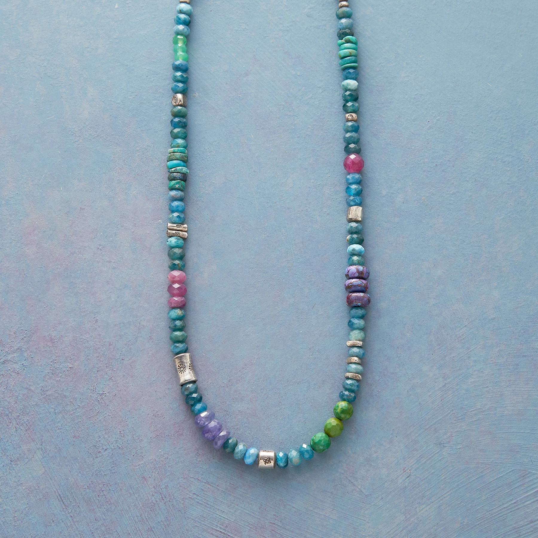 Gems from around the world flow effortlessly in a river of color. Handcrafted in USA with turquoise, pink tourmaline, tinted Czech crystal and more. Thai and sterling silver. Lobster clasp. Exclusive. 16″-17-1/2″l.