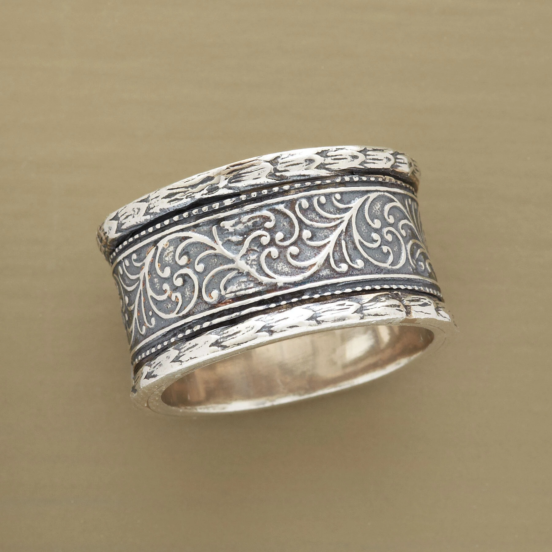 Within textured borders, hand cast vines creep and crawl around our exclusive, sterling silver ring. Whole sizes 6-10. 1/2″w.