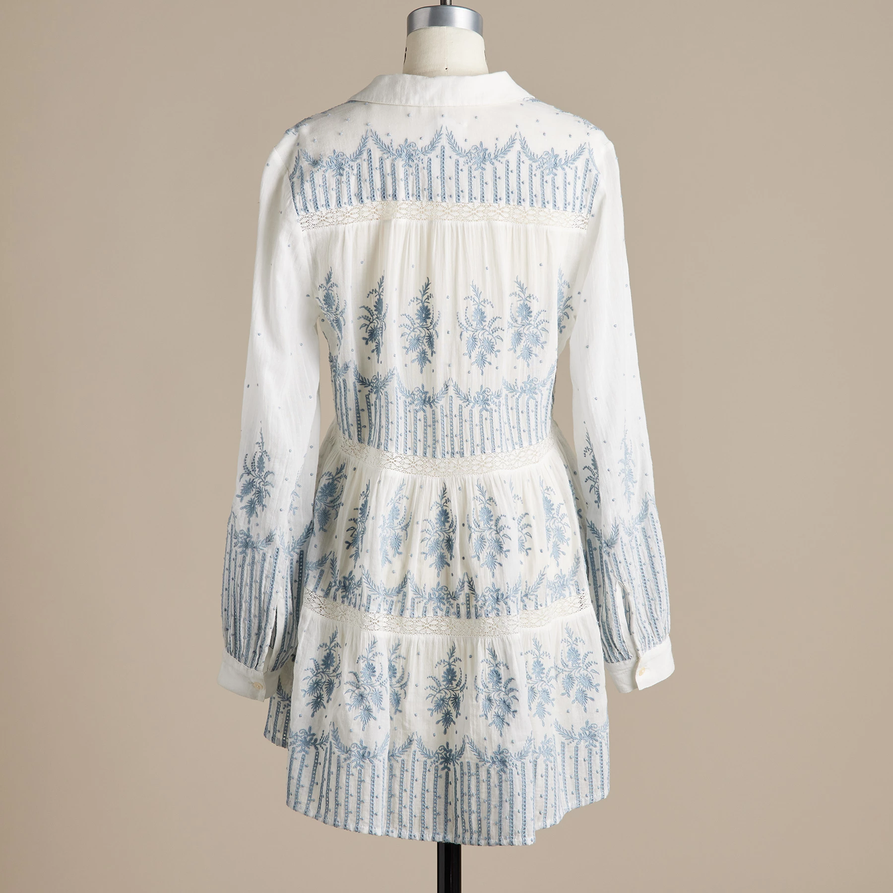 Intricately embroidered, tiered tunic with lace insets, shell button front. Cotton. Hand wash. Imported. Exclusive. Sizes XXS (00), XS (0 to 2), S (4 to 6), M (8 to 10), L (12 to 14), XL (16 to 18). Approx. 28″L.