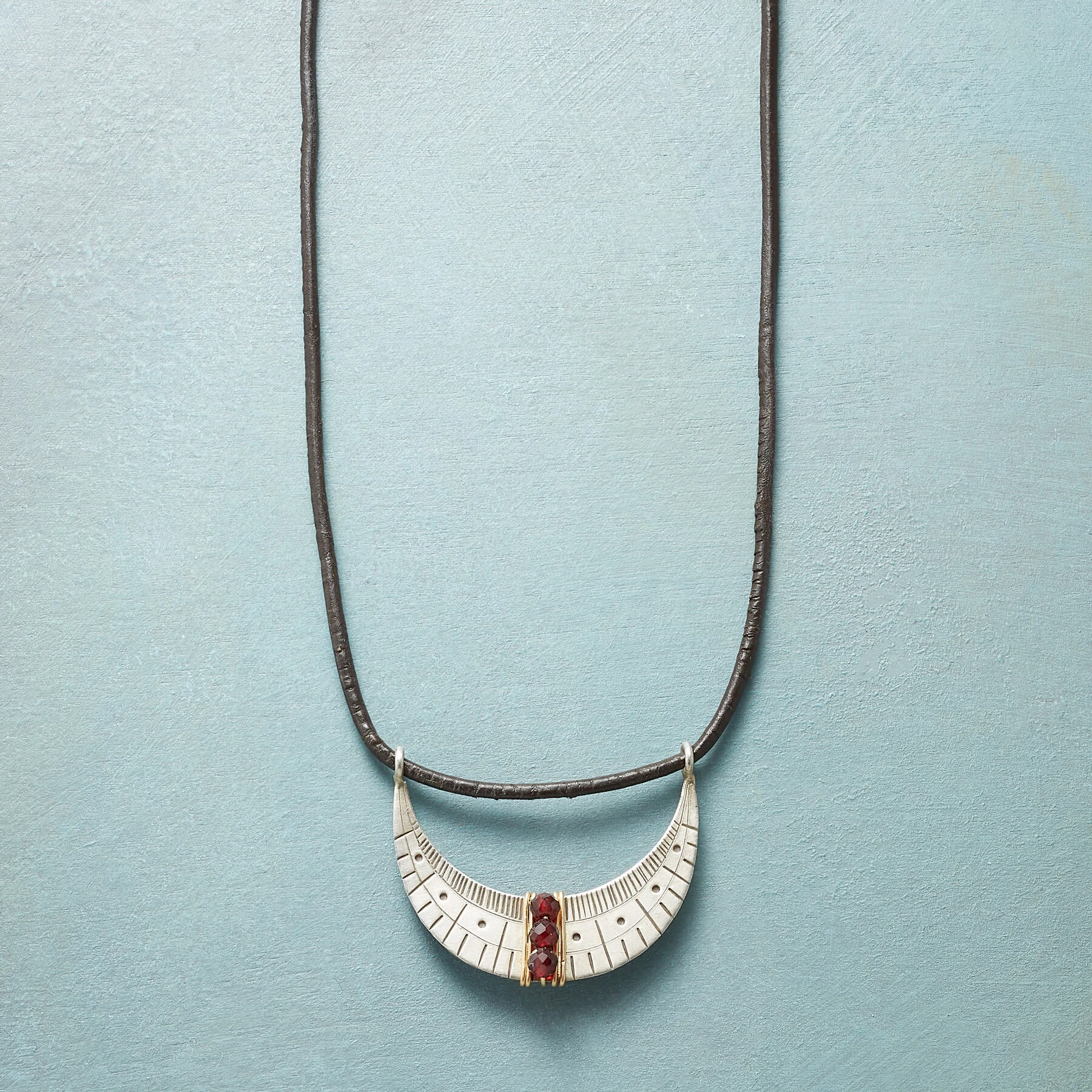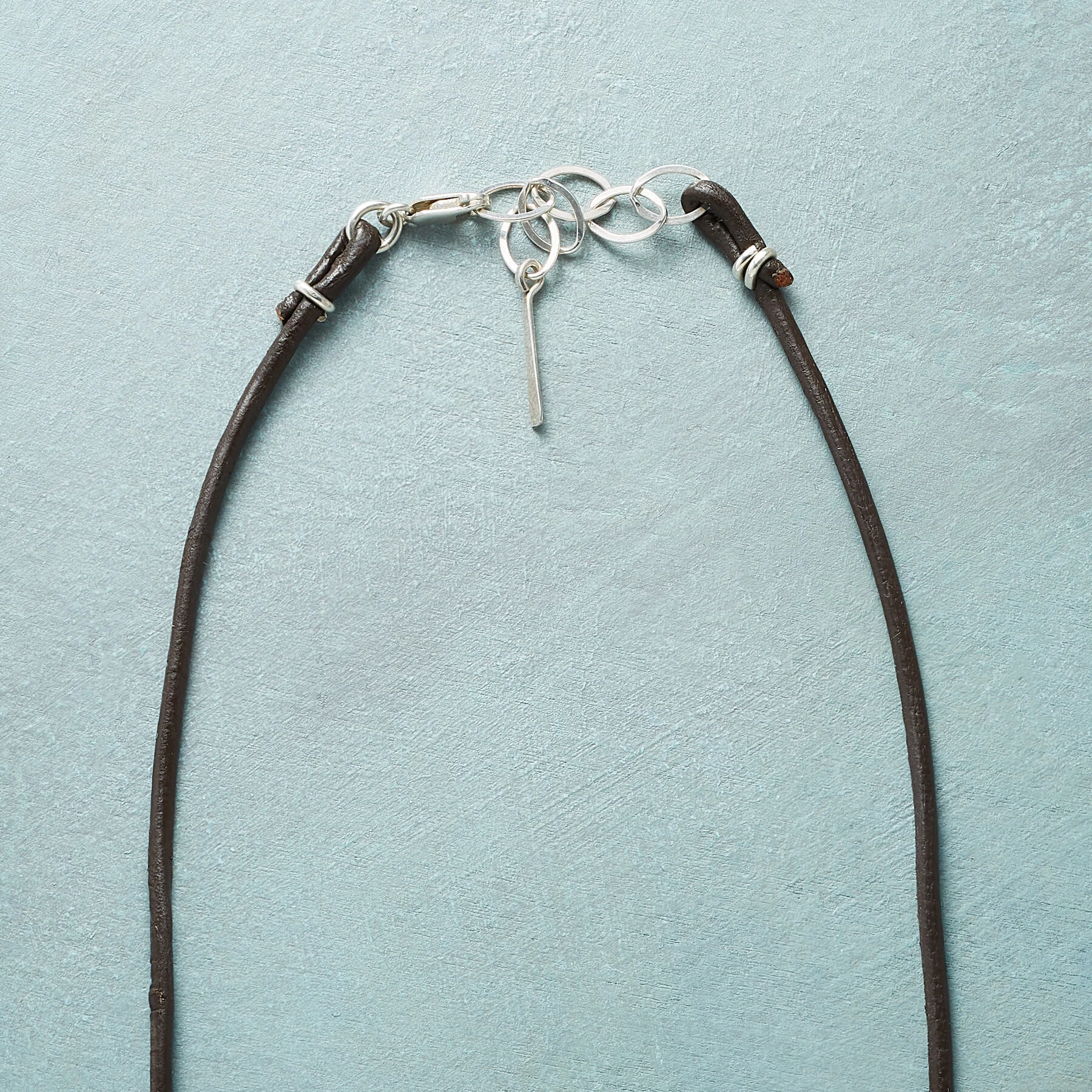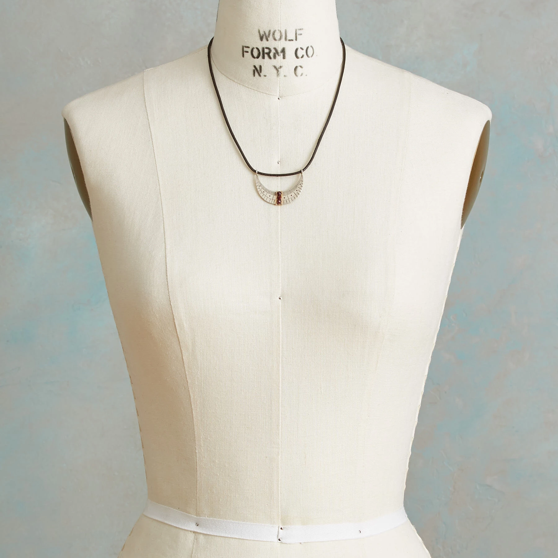 Strung along 14kt gold-filled wire, three garnets span etched sterling silver like markers on a mariner’s compass. Dark brown leather cord with sterling lobster clasp. Handmade in USA. Exclusive. 17″-18-1/2″l.