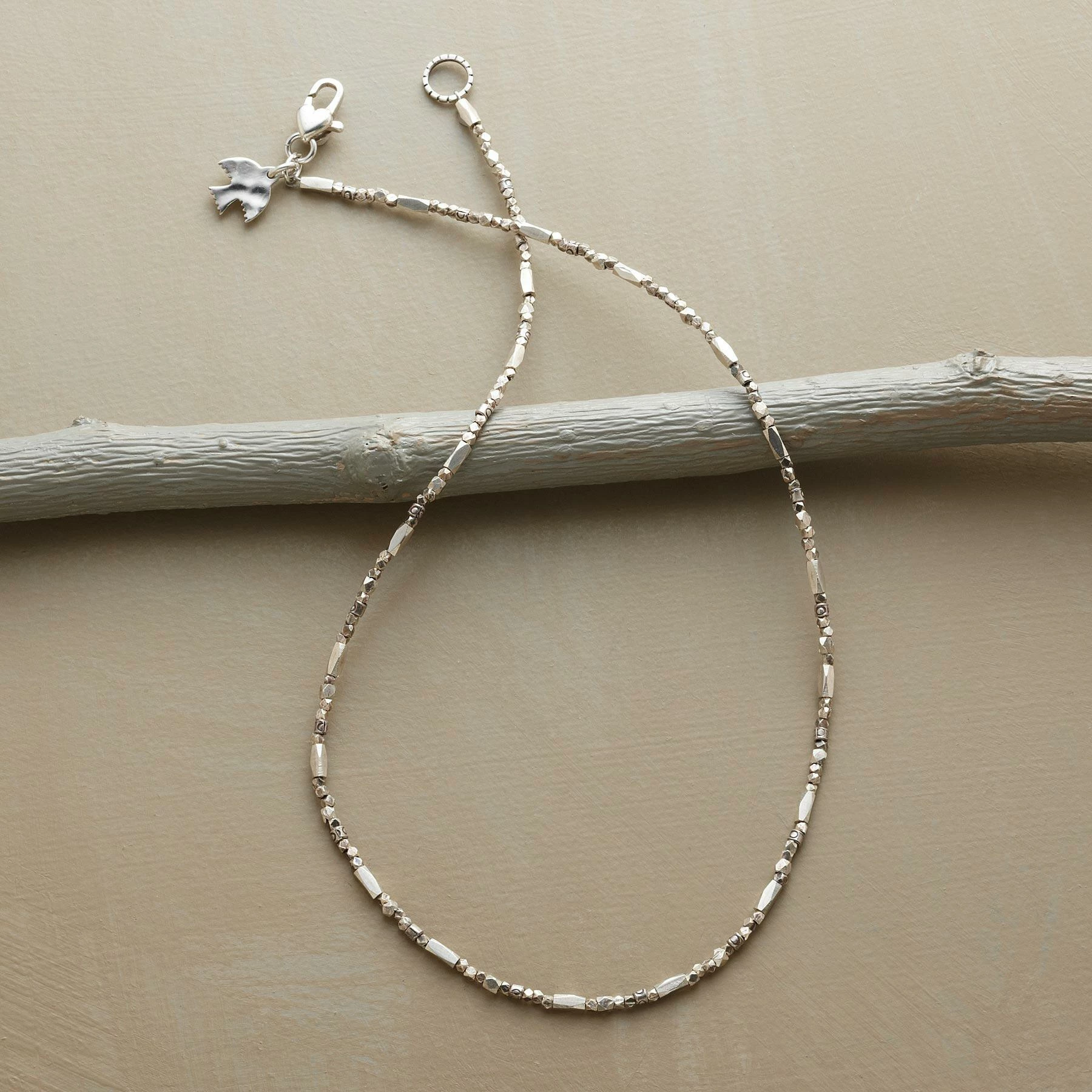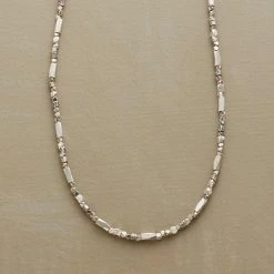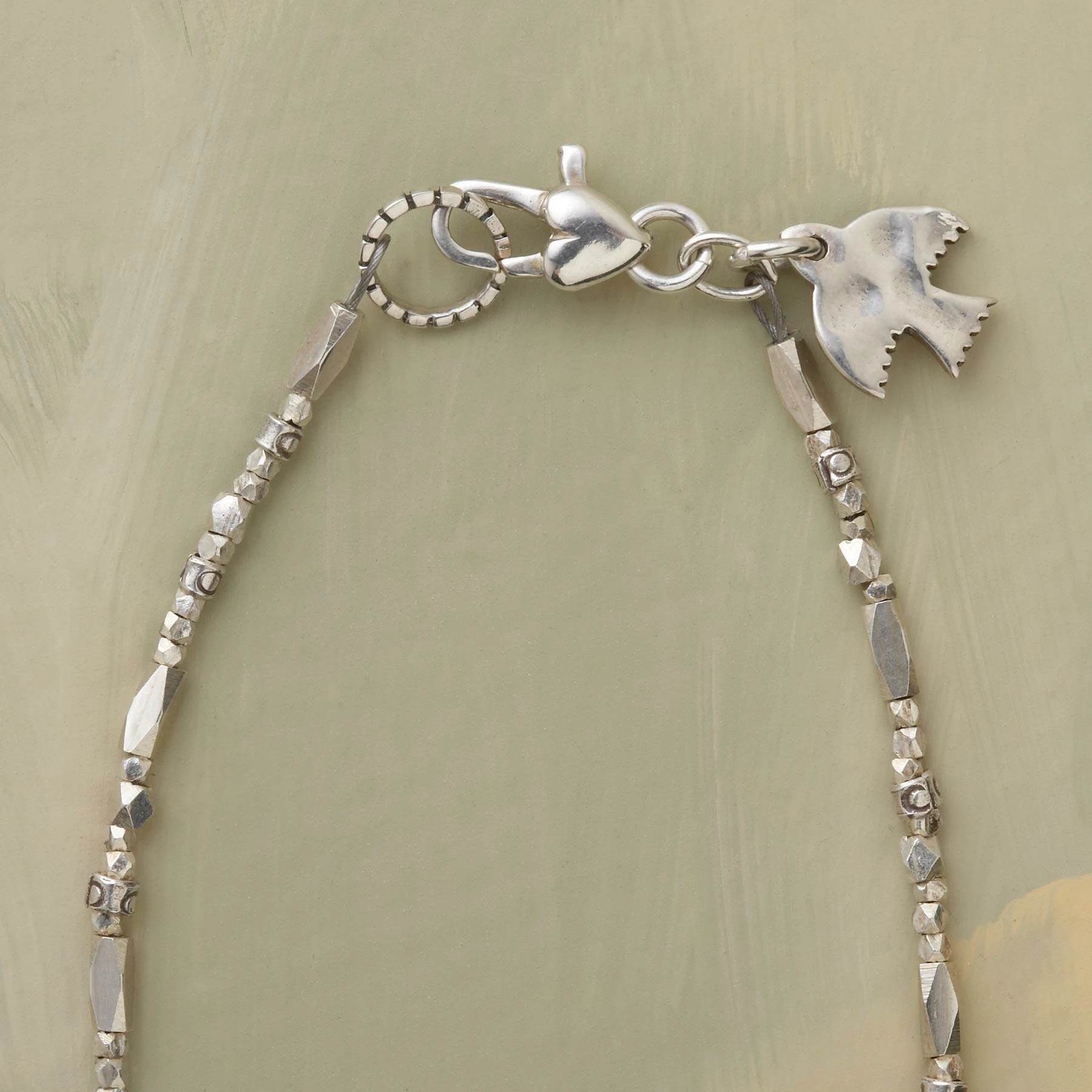 In this silver beaded necklace, four different kinds of sterling silver beads are strung together for maximum intrigue and light-reflecting dazzle. Silver heart clasp. Handcrafted. Exclusive. 16″L.