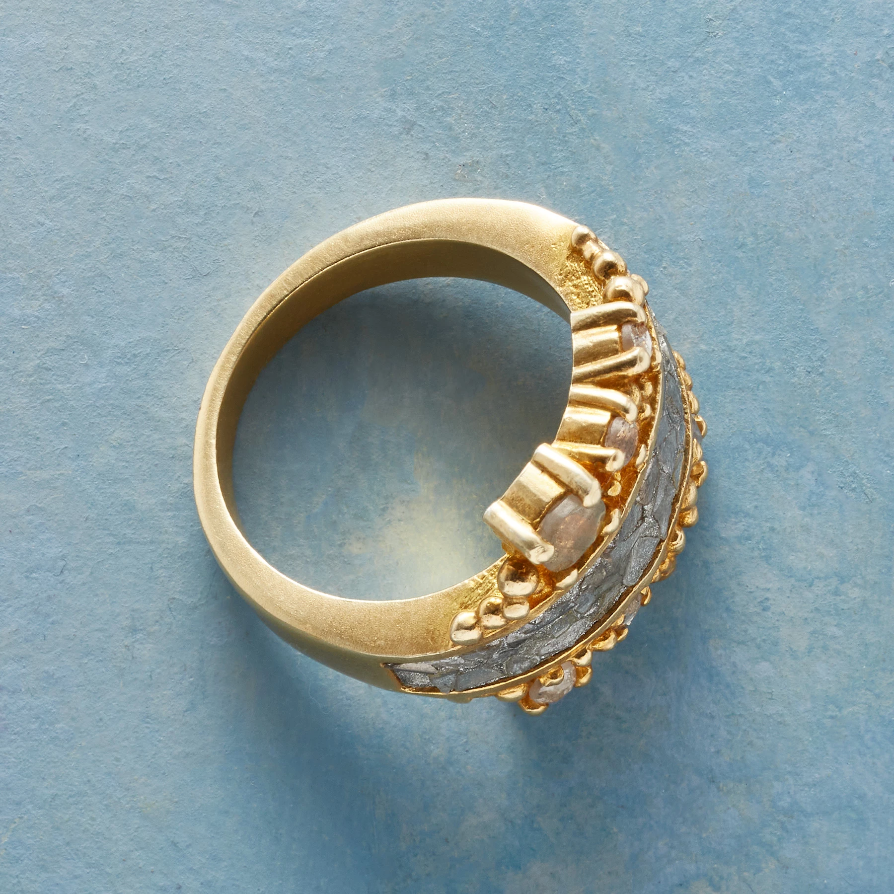 A radiant river of raw diamonds flows in a channel of 18kt gold vermeil, with rose-cut diamonds and labradorite flashing on the beaded banks. The substantial band tapers to the back. Handmade. Whole sizes 5 to 9.