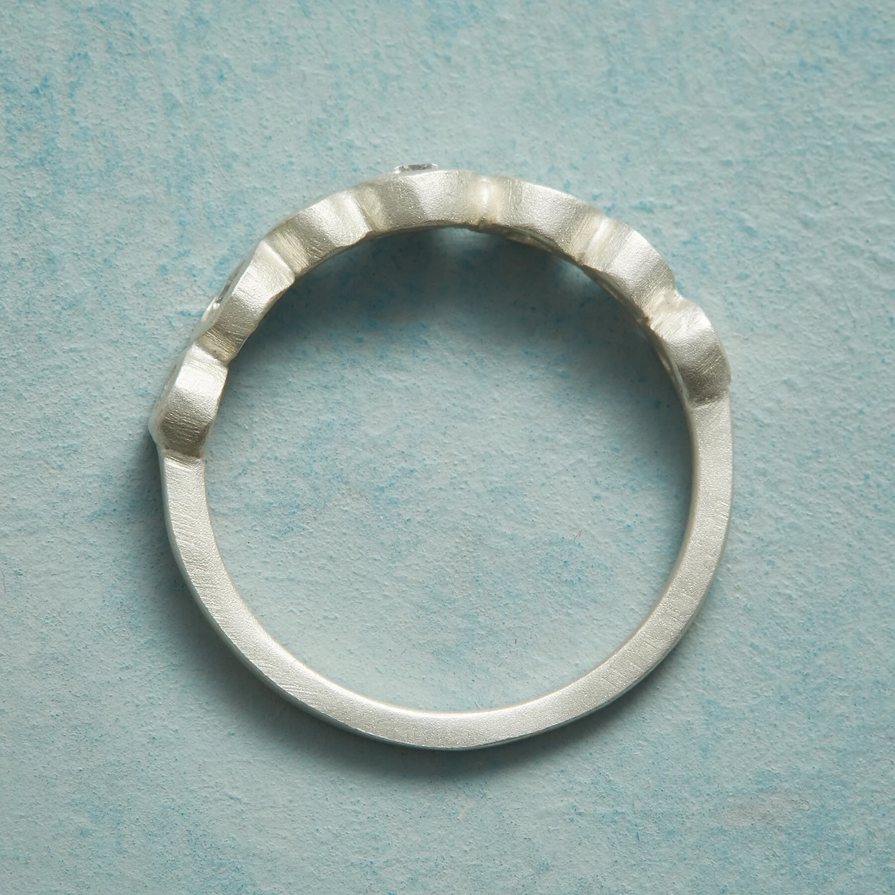 Chunky little bezels embrace randomly sized sparkling diamonds in this ring, set seven in a row atop the finger. Handmade in USA by Saundra Messinger in matte sterling silver. Whole sizes 5 to 9.