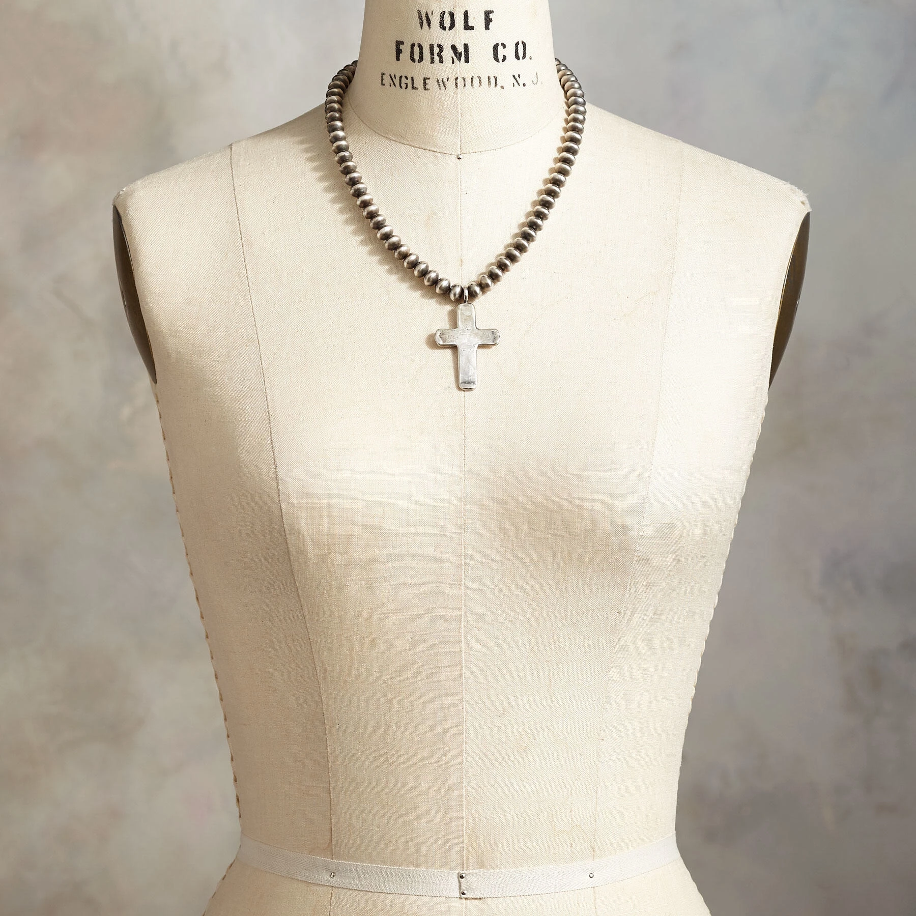 Santa Fe silversmith Dennis Hogan chooses a strong and simple design for a sterling silver necklace with enduring beauty, dropping a rustic hand forged cross from a strand of handmade sterling beads, often called “Navajo pearls.” Handmade hook and loop clasp. Oxidized brushed patina becomes richer with time and wear. USA. Exclusive. Cross measures 1-5/8″ x 1″. 18″L.
