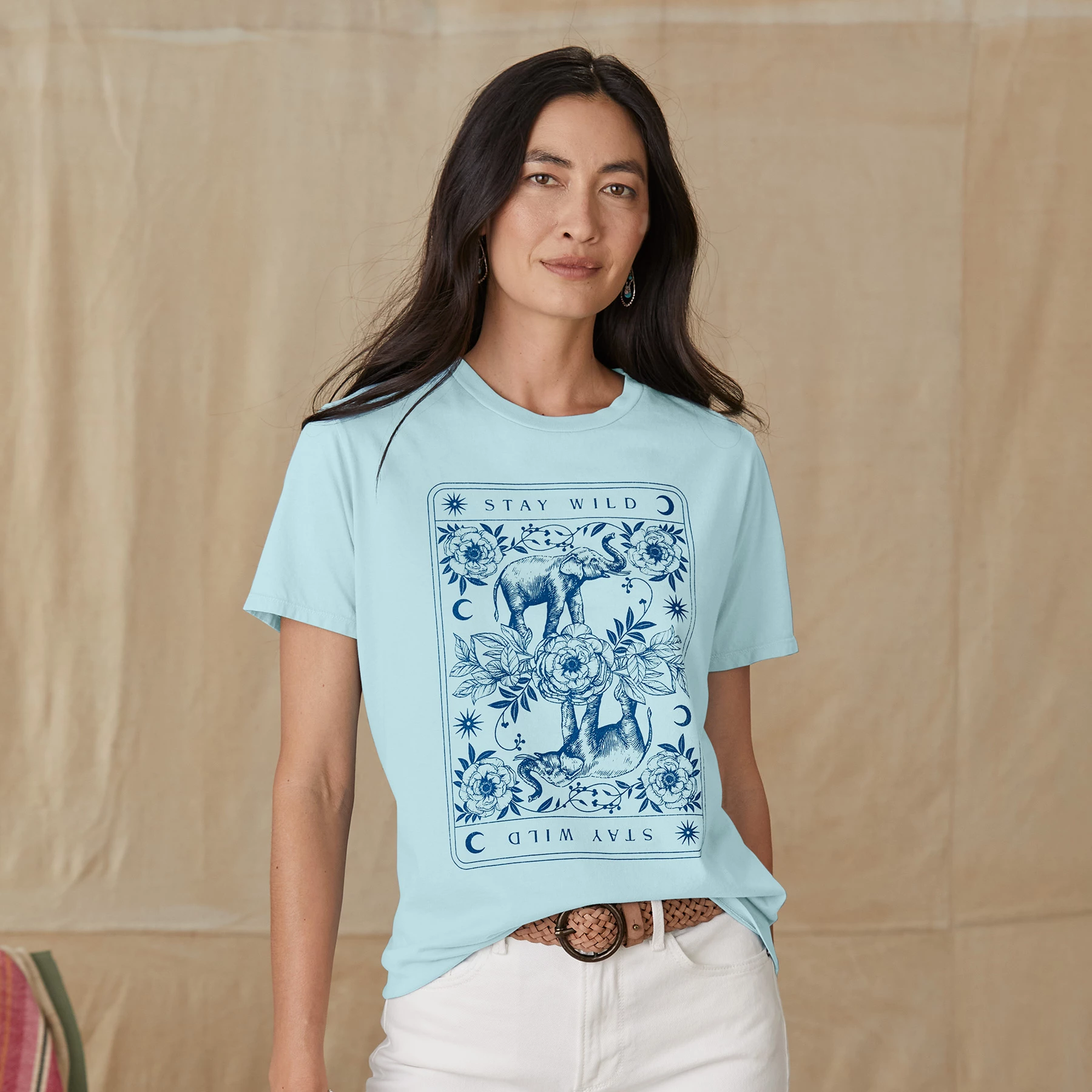 Two elephants with trunks turned up deliver good luck to our easy graphic tee with “stay wild moon child” written for inspiration. Cotton. Machine wash. USA. Exclusive. Sizes XS (0 to 2), S (4 to 6), M (8 to 10), L (12 to 14), XL (16 to 18), XXL (20 to 22). Approx. 25-1/2″L.