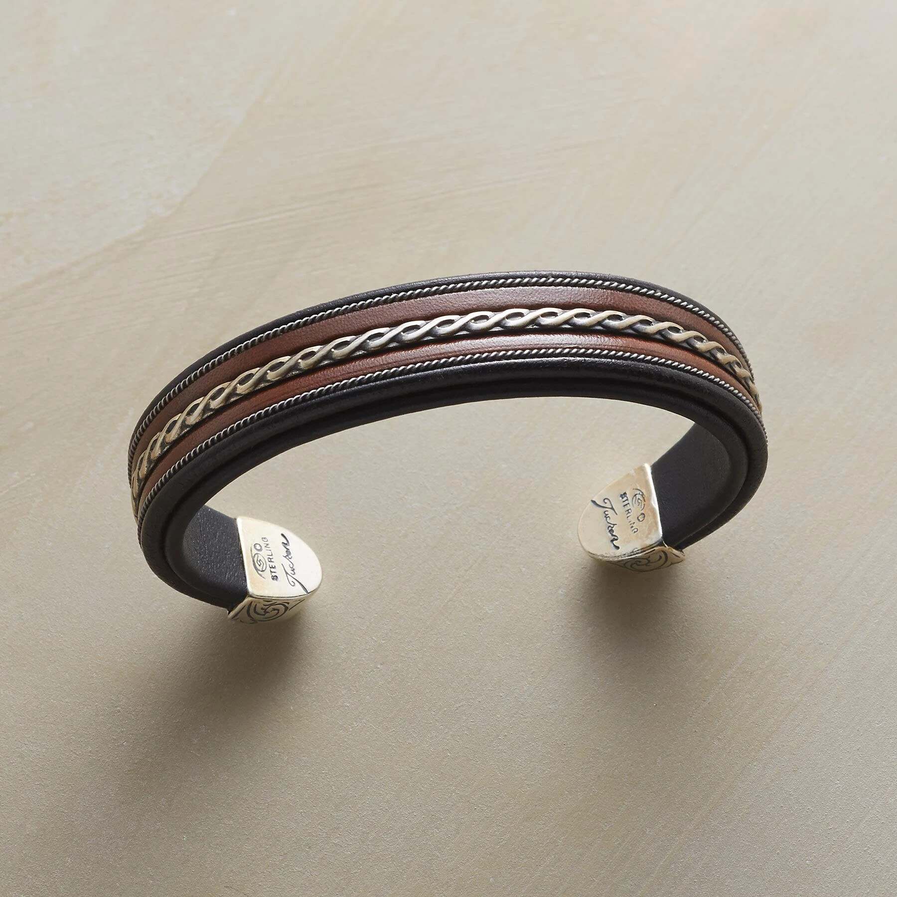 A leather-wrapped brass cuff bracelet for men, embellished with hand-scrolled sterling silver tips and twisted sterling wire braid, lassos masculine style. USA. Handcrafted exclusively for Sundance. 2-1/2″ dia.