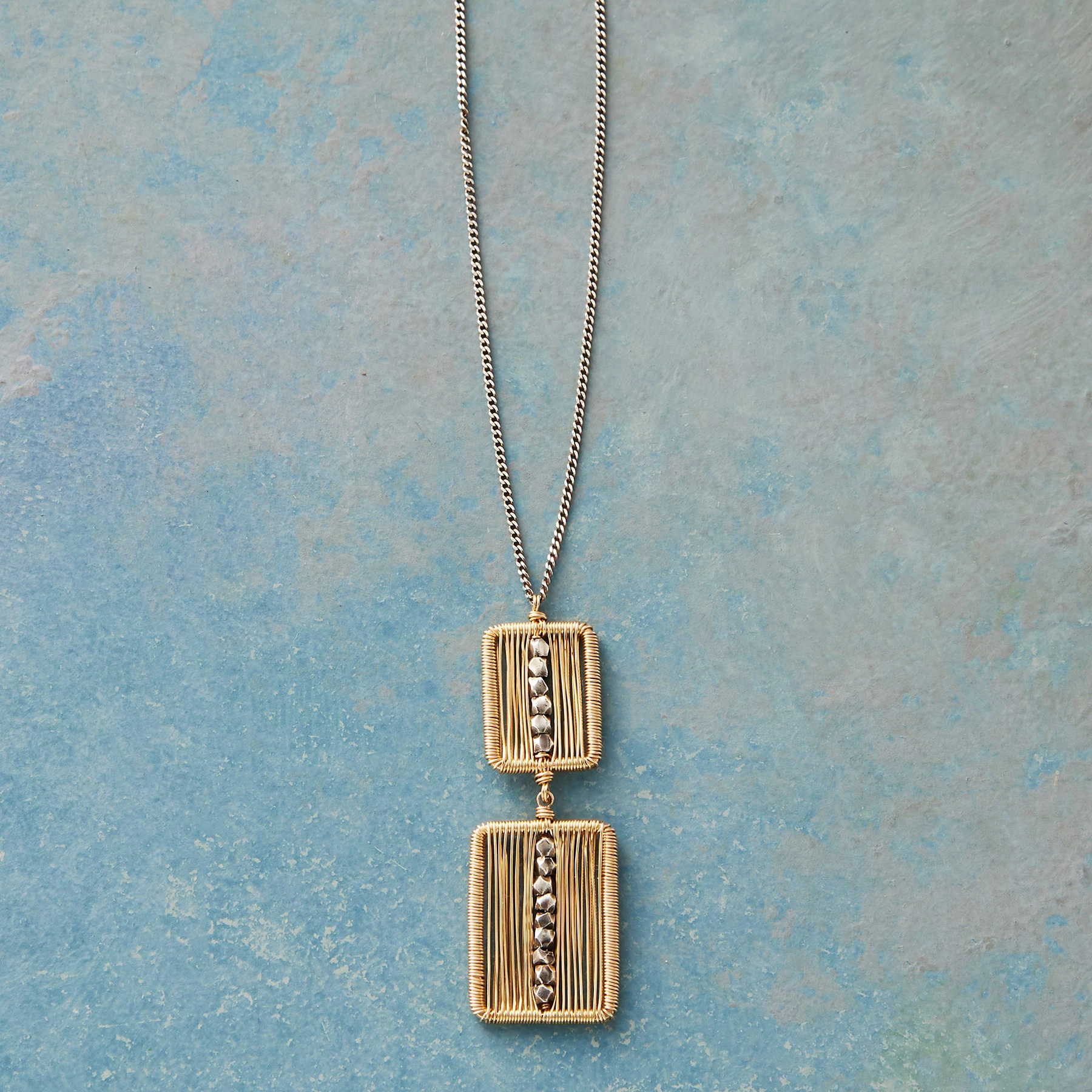 A contrasting streak of hammered beads bisects frames wound with 14kt gold filled wire. Handmade in USA by Dana Kellin, with sterling silver beads, chain, lobster clasp. 18″L; 1-3/4″ drop.