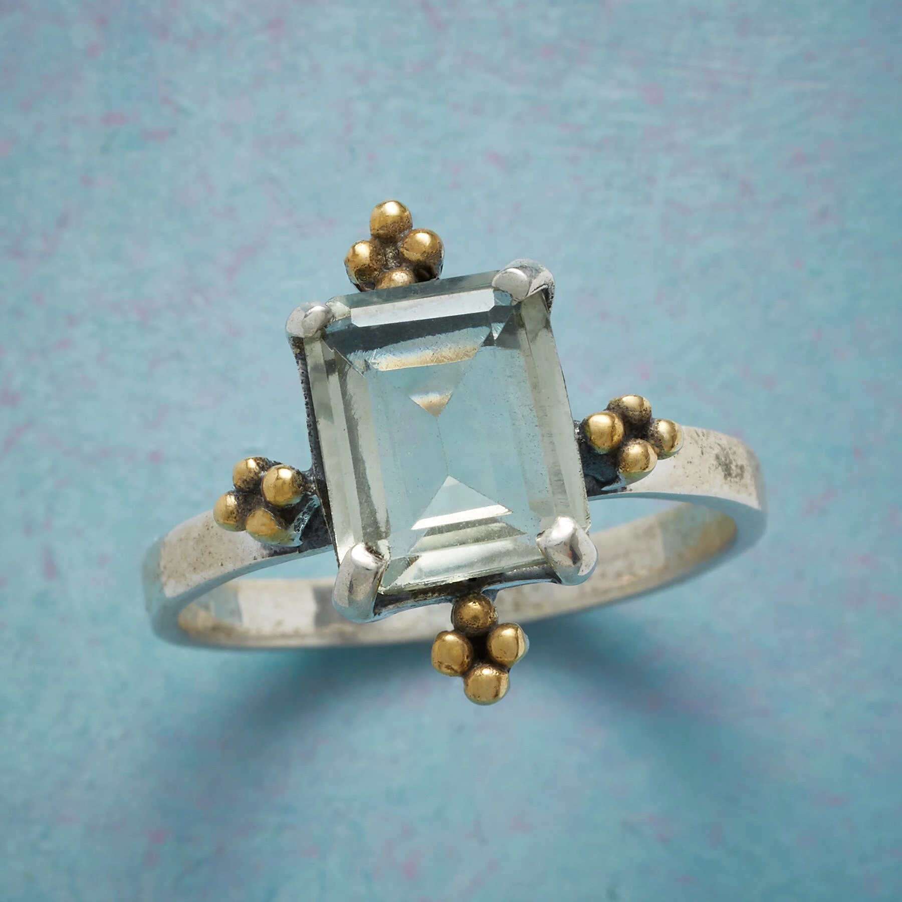 Our sterling silver ring floods green amethyst with light and warms its soft tint with 14kt gold-plated beading. Exclusive. Whole sizes 5 to 10.