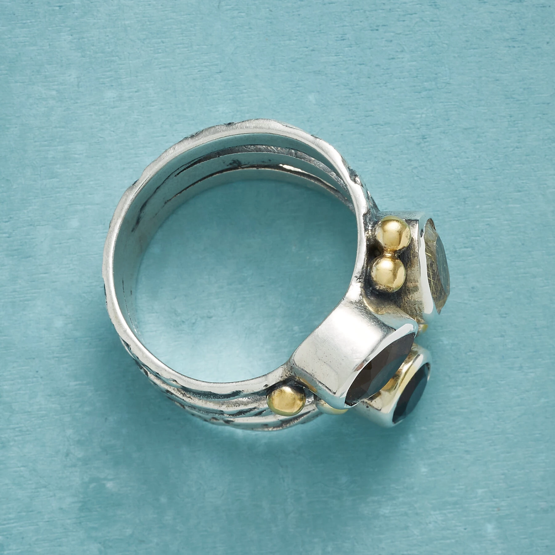 Three flowered bands joined as one beneath the finger, each topped with a chunky gemstone and 14kt gold plated beads. Sterling silver, with black onyx, golden rutile and smoky quartz. Exclusive. Whole sizes 5 to 10. 1/2″ tapers to 1/4″W.