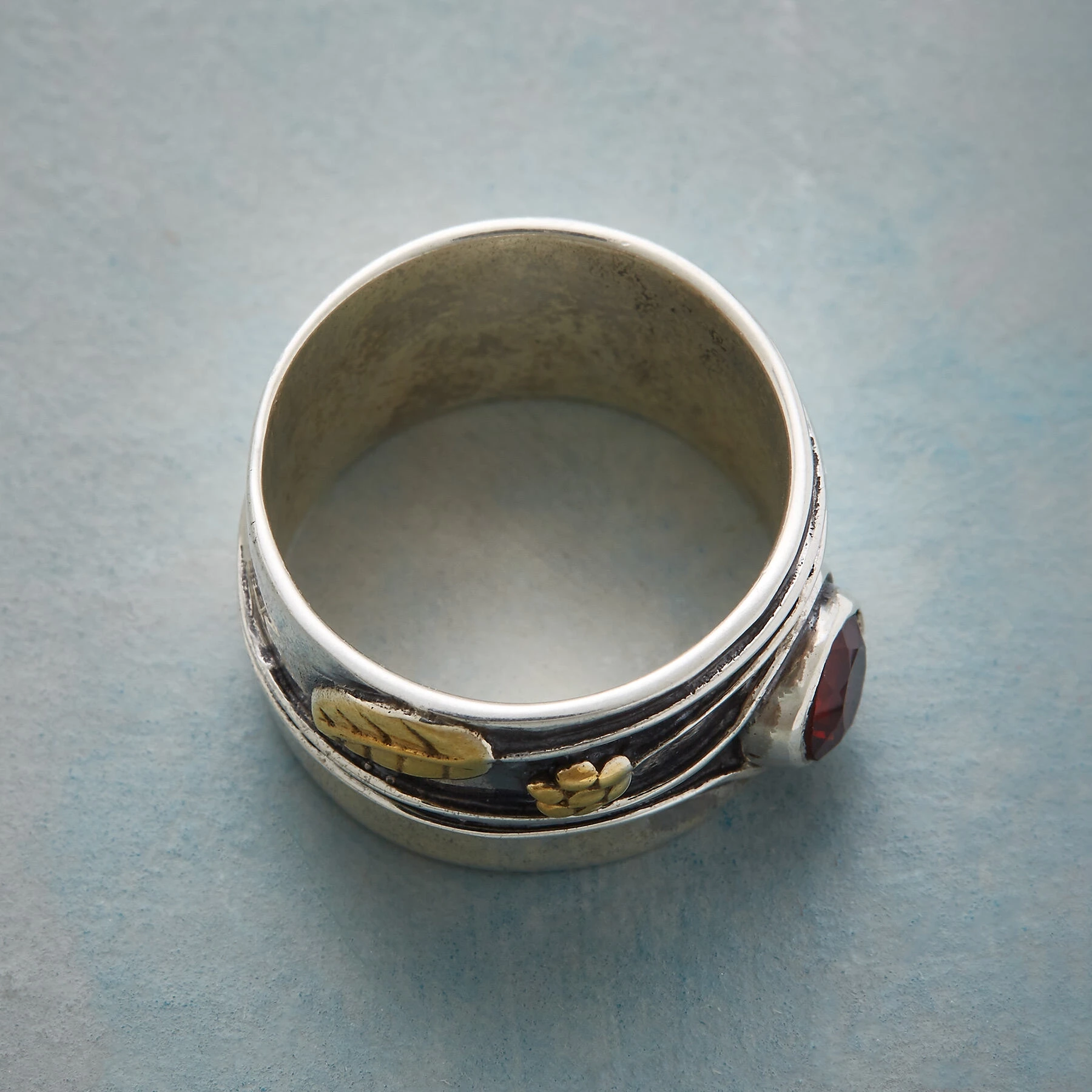 A garnet blooms on a wire vine dotted with a 14kt gold plated leaf and flower. Exclusive. Oxidized sterling silver. Whole sizes 5 to 10.