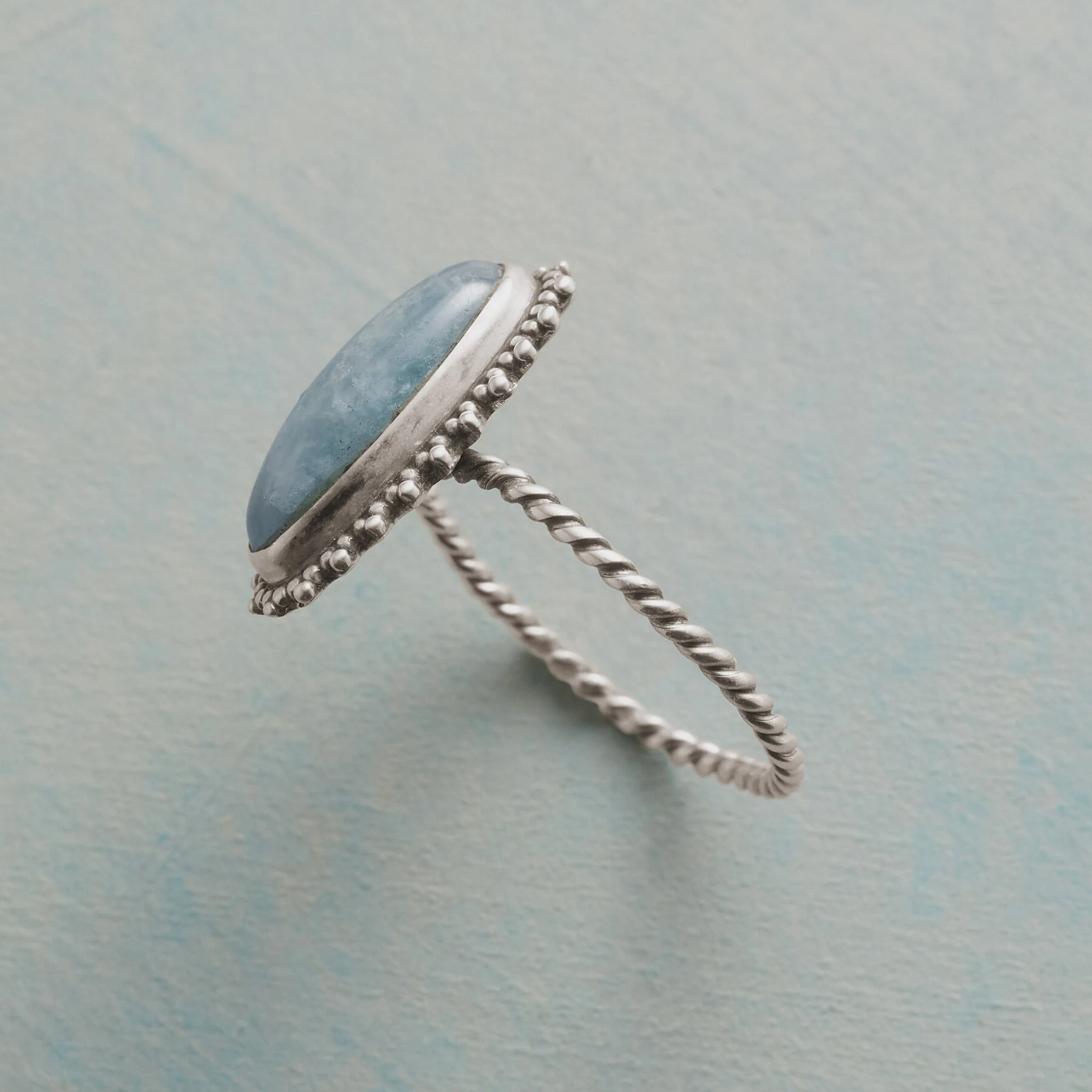 Milky aquamarine, surrounded by delicate sterling beading and set on a roped sterling silver band, swirls in the shade of the sea. Exclusive. Whole sizes 5-9.