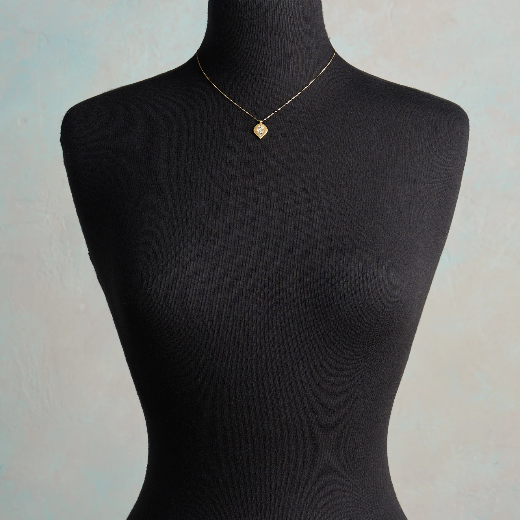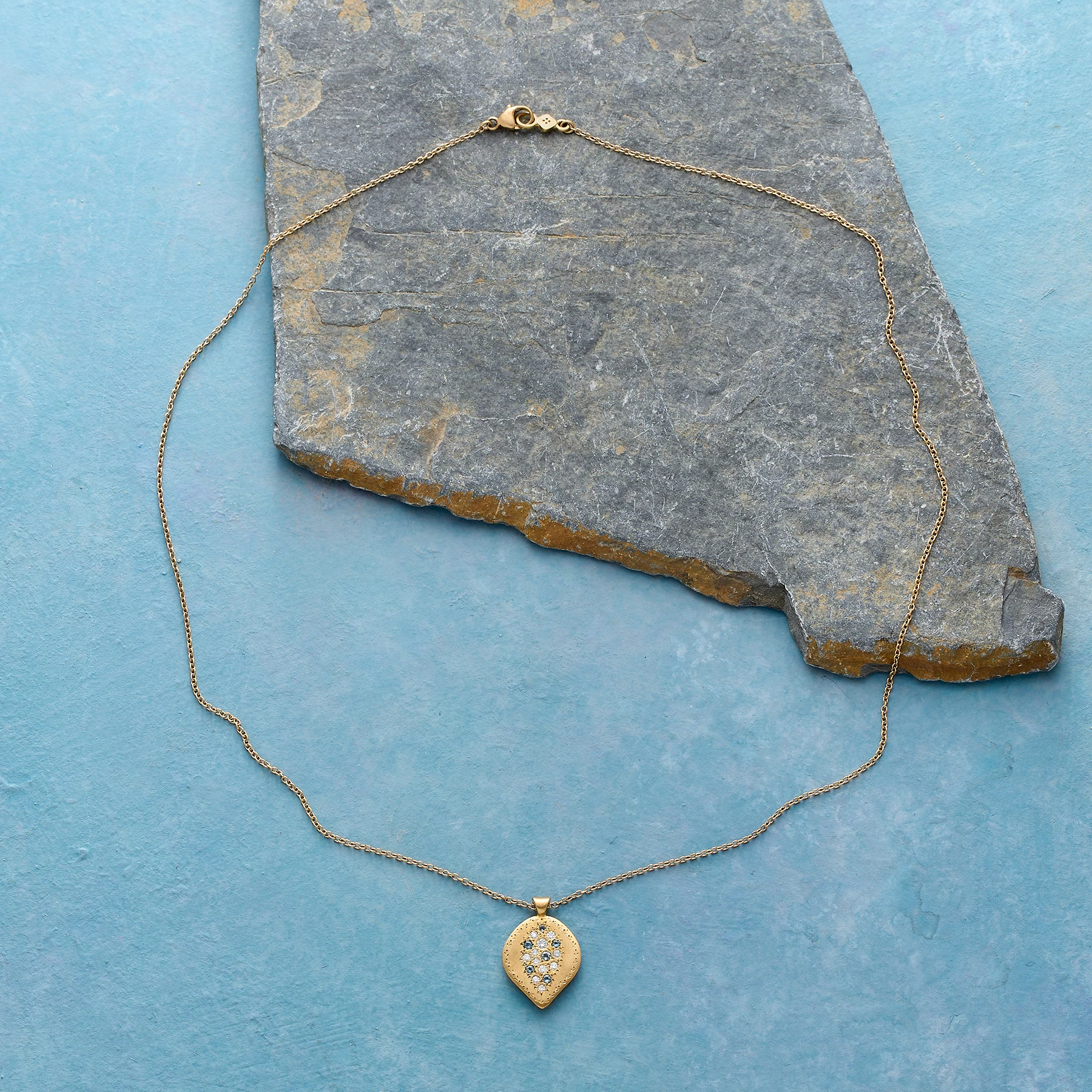 Diamond and aquamarine glints catch the light on this exquisitely handcrafted and delicately detailed 18kt gold pendant by Adel Chefridi. The pendant hangs upon a 18kt gold chain with a lobster clasp. Made in USA. 16″L drop.