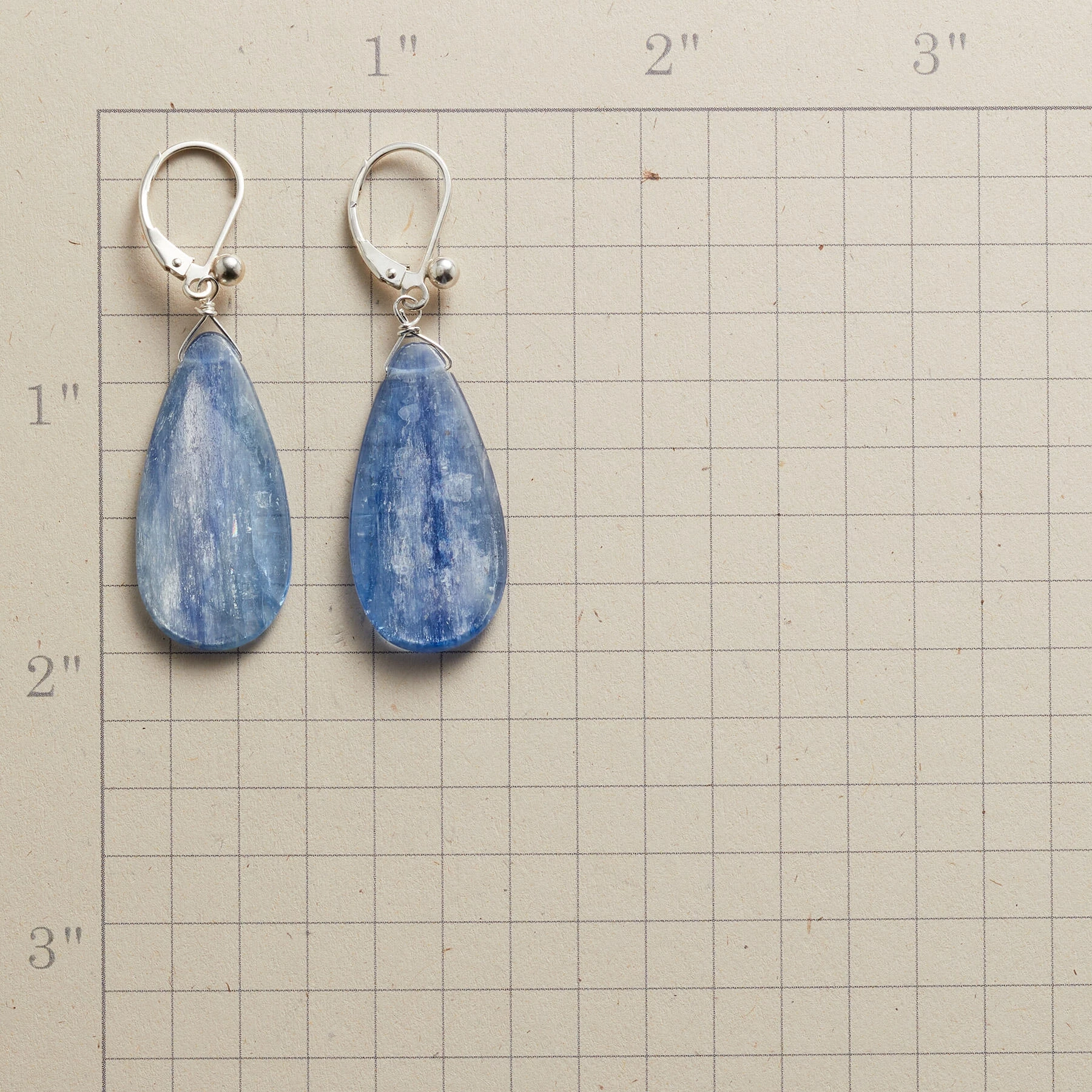 Teardrop tabs of glassy blue kyanite, each streaked with unique inclusions. The stone is prized for its calming influence. Exclusive. Handcrafted in USA with sterling silver accent bead and lever back wires. 1-7/8″L.