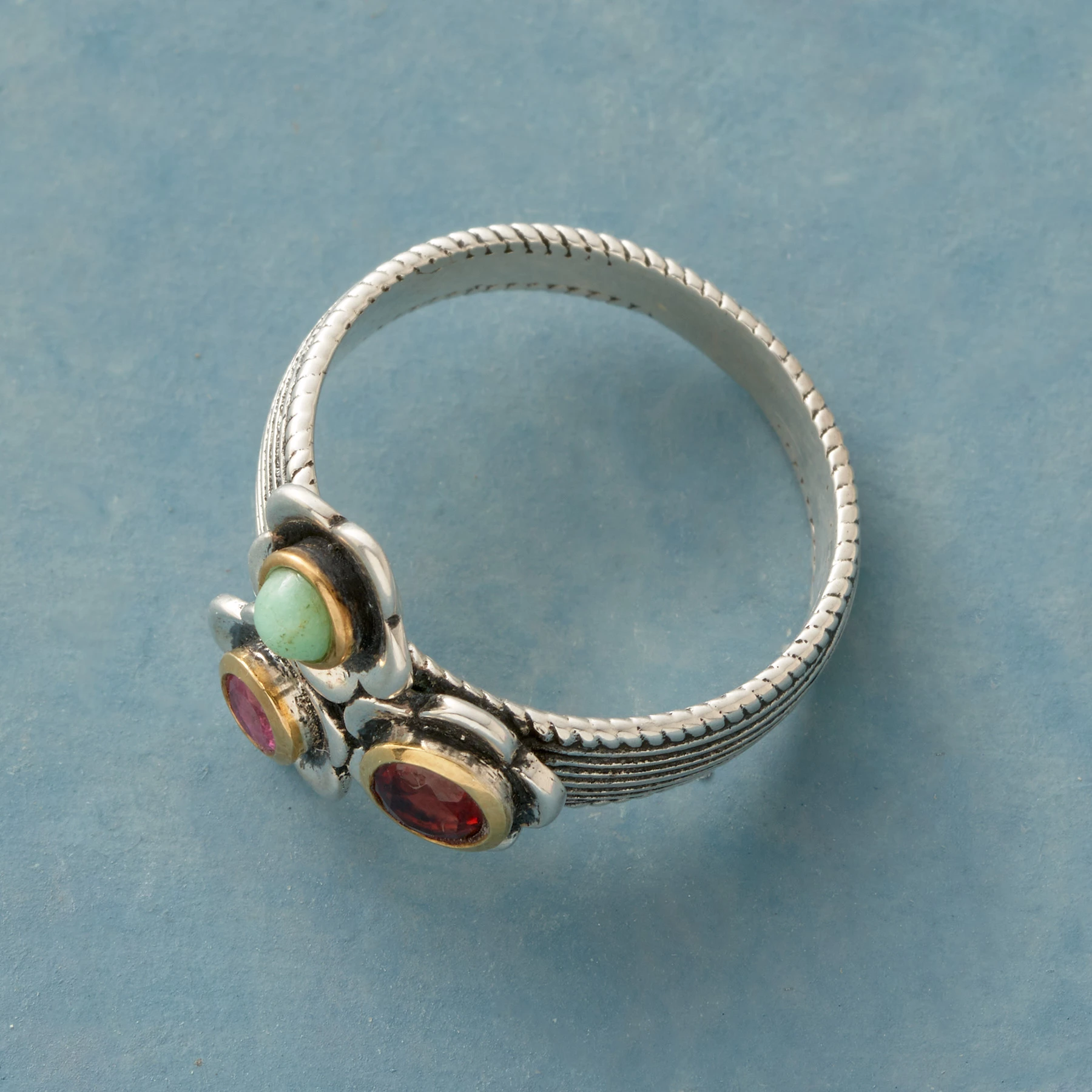Three gems nestle together in 14kt gold plated bezels: pink tourmaline, chrysoprase and garnet. Sterling silver band. Handmade. Exclusive. Whole sizes 5 to 9.