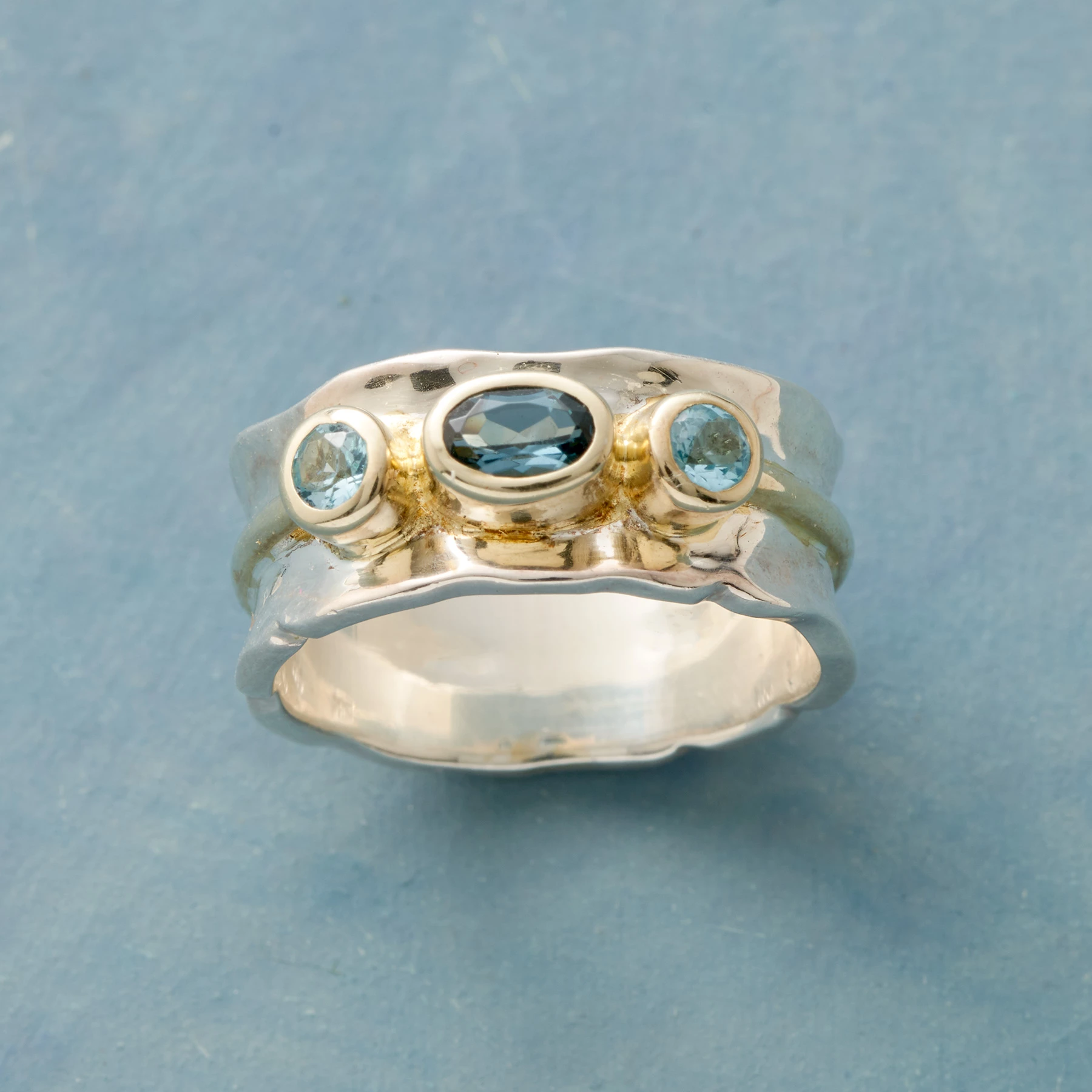 Cinching the center of our convex sterling silver ring, an 18kt gold-vermeil band hosts a London blue topaz oval flanked by blue topaz rounds. Handcrafted. Exclusive. Whole sizes 5 to 9.