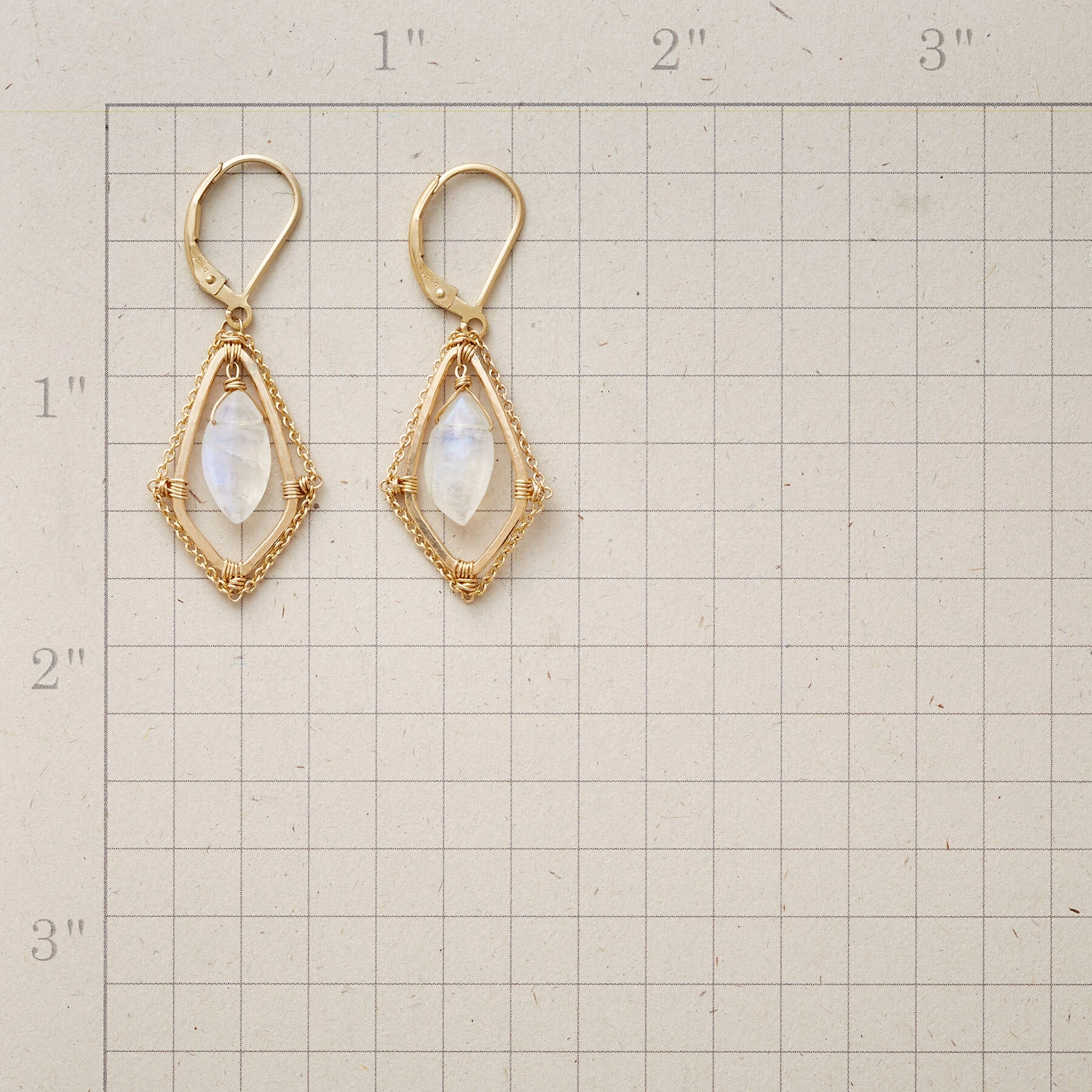 Little links form lacy edges around Dana Kellin’s earrings, creating a see-through corridor; rainbow moonstone suspended within. Handcrafted in USA. 14kt gold filled; lever back wires. 1-1/2″L.