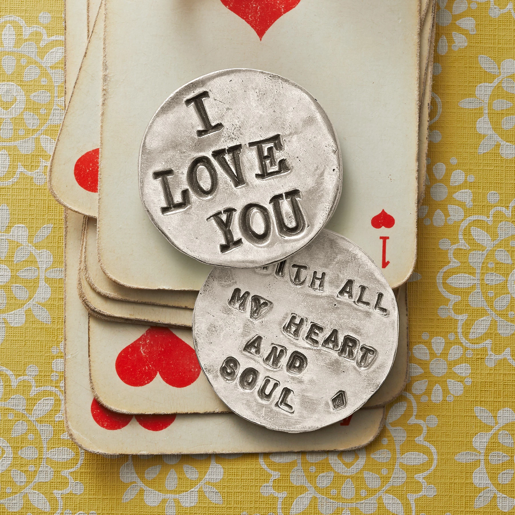 Let them know your heart is always with them with this hand-cast pewter token, stamped on front with a declaration of love and the words “with all my heart and soul” on back. Made in USA. Exclusive. 1-1/2″ dia.