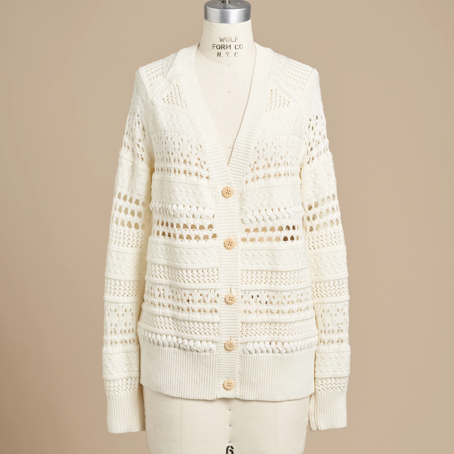 An airy and open, mixed-stitch cardigan with twill tape braided through the body of the sweater for marvelous texture. With rib trim and wooden buttons. Relaxed, easy fit. Cotton/acrylic. Hand wash. Imported. Exclusive. Sizes XS (0–2), S (4–6), M (8–10), L (12–14), XL (16–18), XXL (20–22). Approx. 24-1/2″l.
