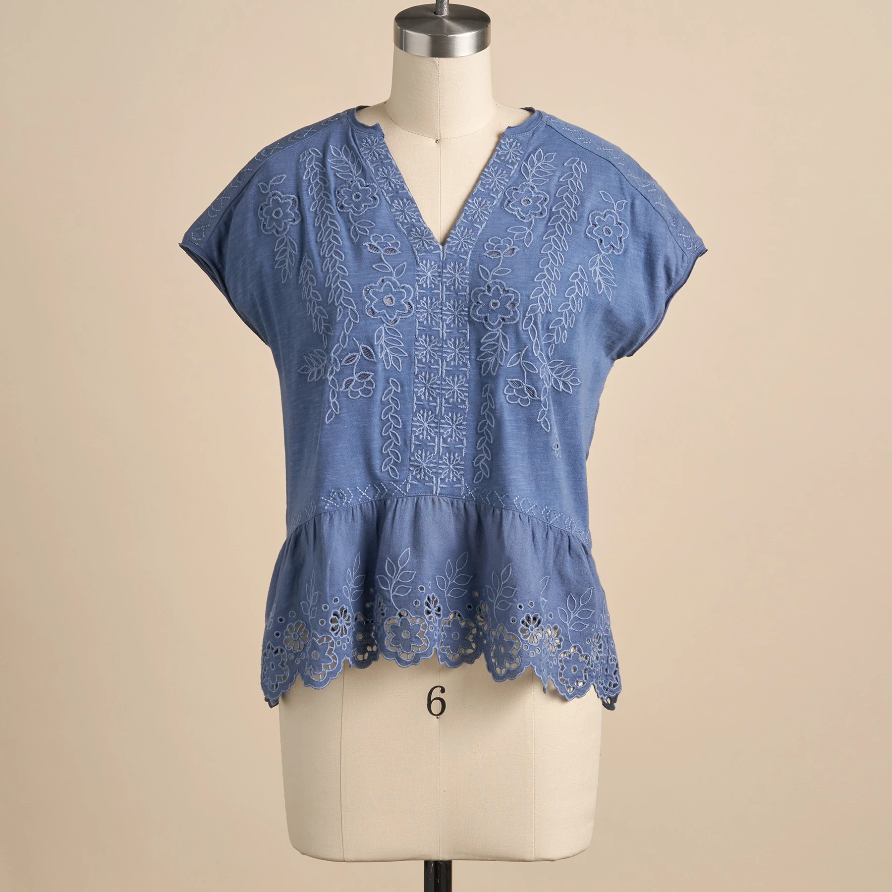 Our mixed fabric top is inspired by blooming florals with detailed embroidery, scalloped hem and feminine flounce at the back yoke. Lace trim and twill tape detail. Cotton. Machine wash. Imported. Exclusive. Sizes XXS (00), XS (0–2), S (4–6), M (8–10), L (12–14), XL (16–18). Approx. 21-1/2″l. For a more fitted look, please size down a size.