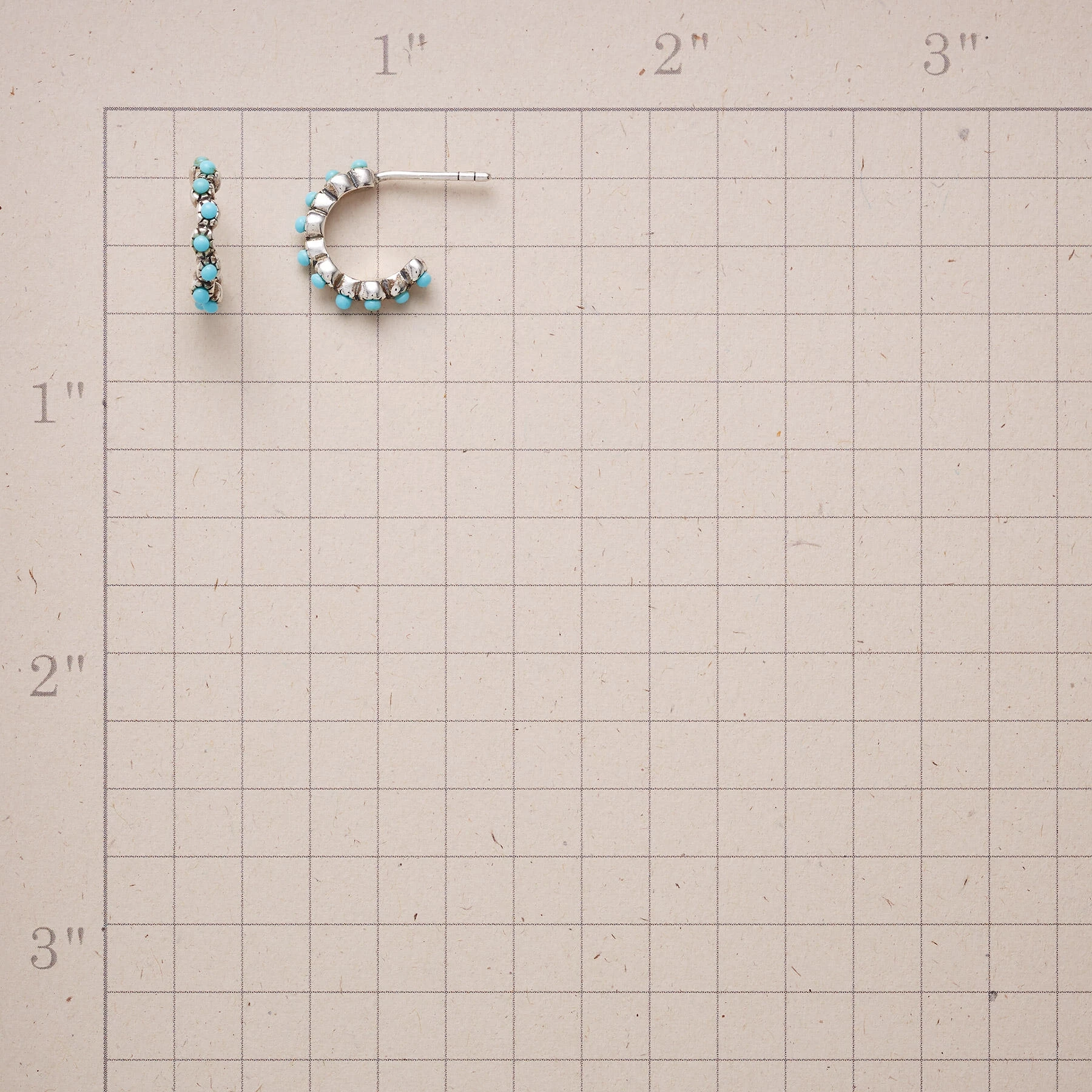 Diminutive turquoise cabochons make a slight zigzag traverse of our sterling silver filigree hoop earrings, perfect for everyday wear. Posts. Handcrafted. Exclusive. 1/2″ dia.
