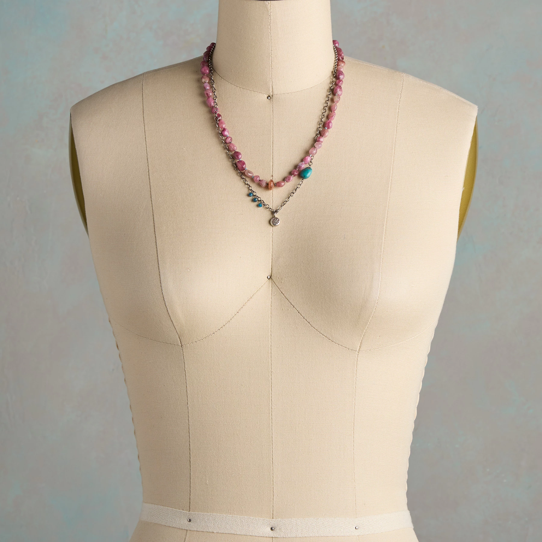 One strand of pink tourmaline and Miyuki glass beads hangs alongside sterling silver links with a smattering of stones and a Thai silver charm. Exclusive. Handmade in USA. 18″ to 19-1/2″L.