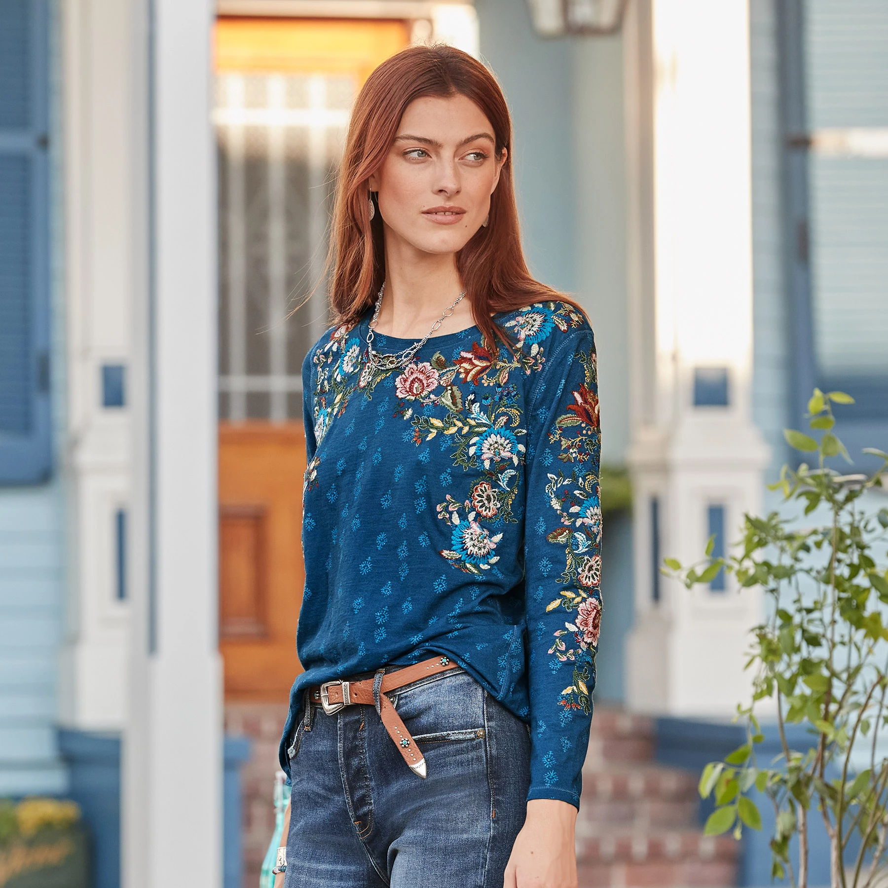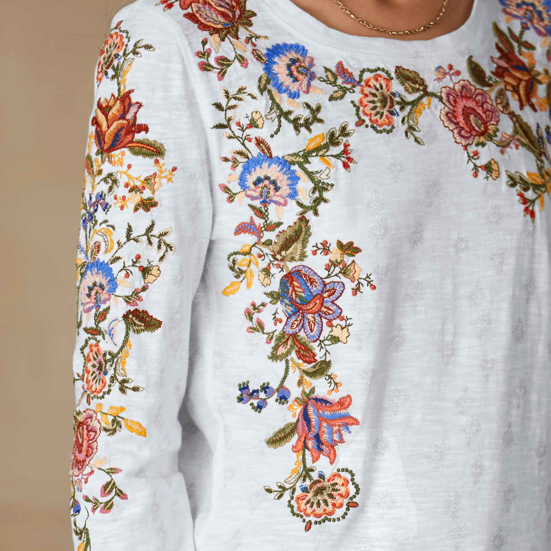 Our lovely, three-quarter sleeve tee with watermark printed flowers setting the backdrop for our lush embroidered florals. Stitching detail, twill tape trim. Cotton. Machine wash. Imported. Exclusive. Sizes XXS (00), XS (0–2), S (4–6), M (8–10), L (12–14), XL (16–18). Approx. 24″l.