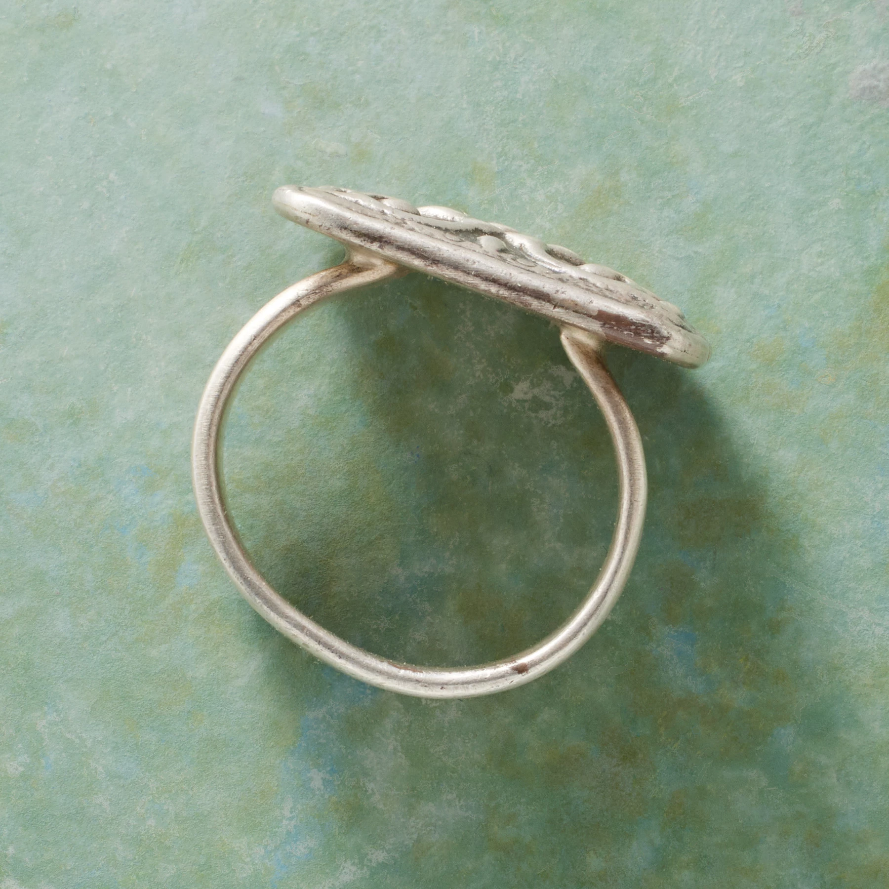 Scrolling vines frame a flower in bas relief on our sterling silver ring. Set on a wide, smooth band, the striking design is both feminine and architectural. Handcrafted. Exclusive. Whole sizes 5 to 10.