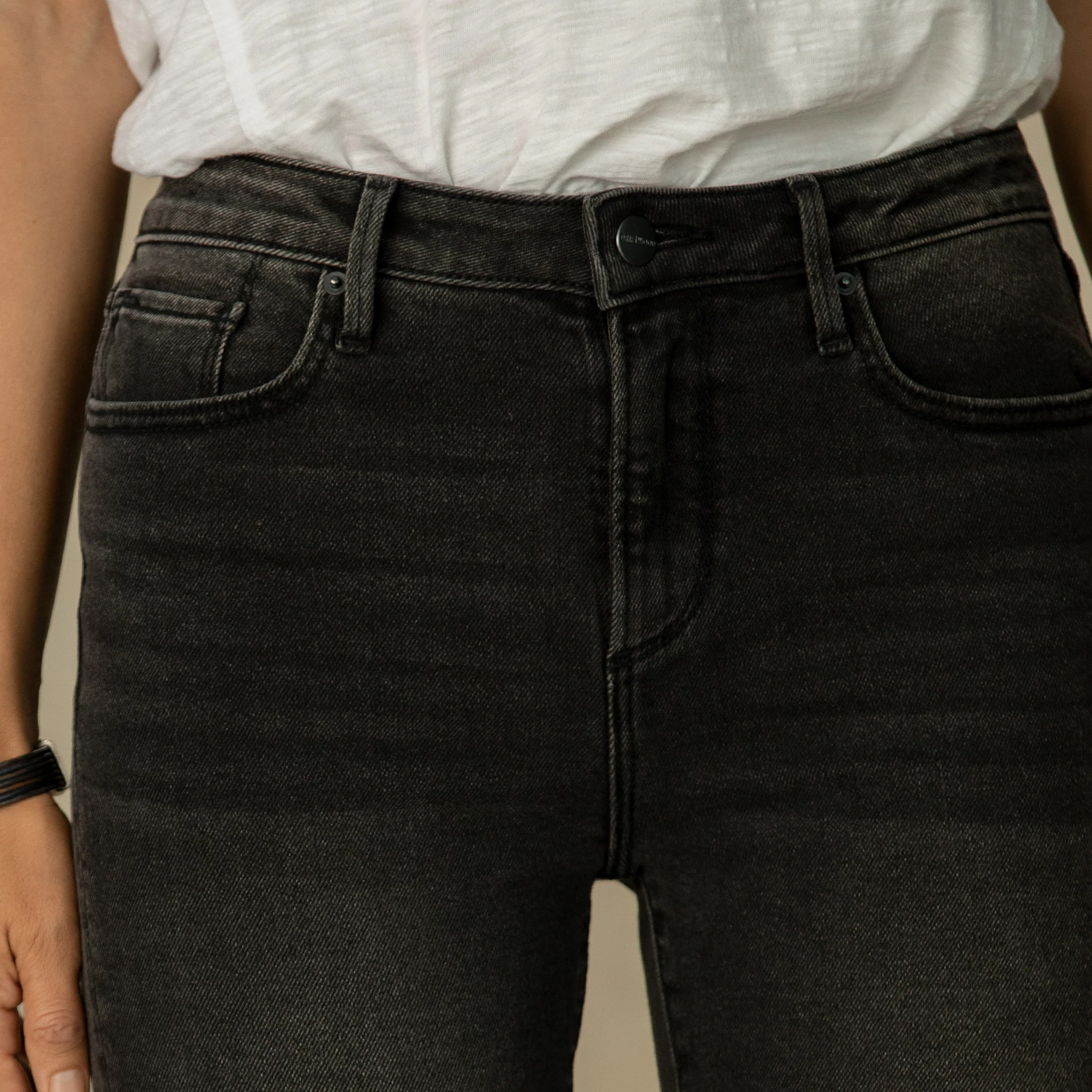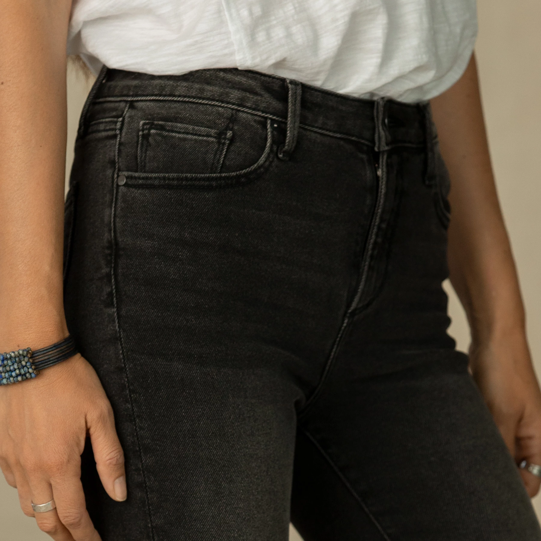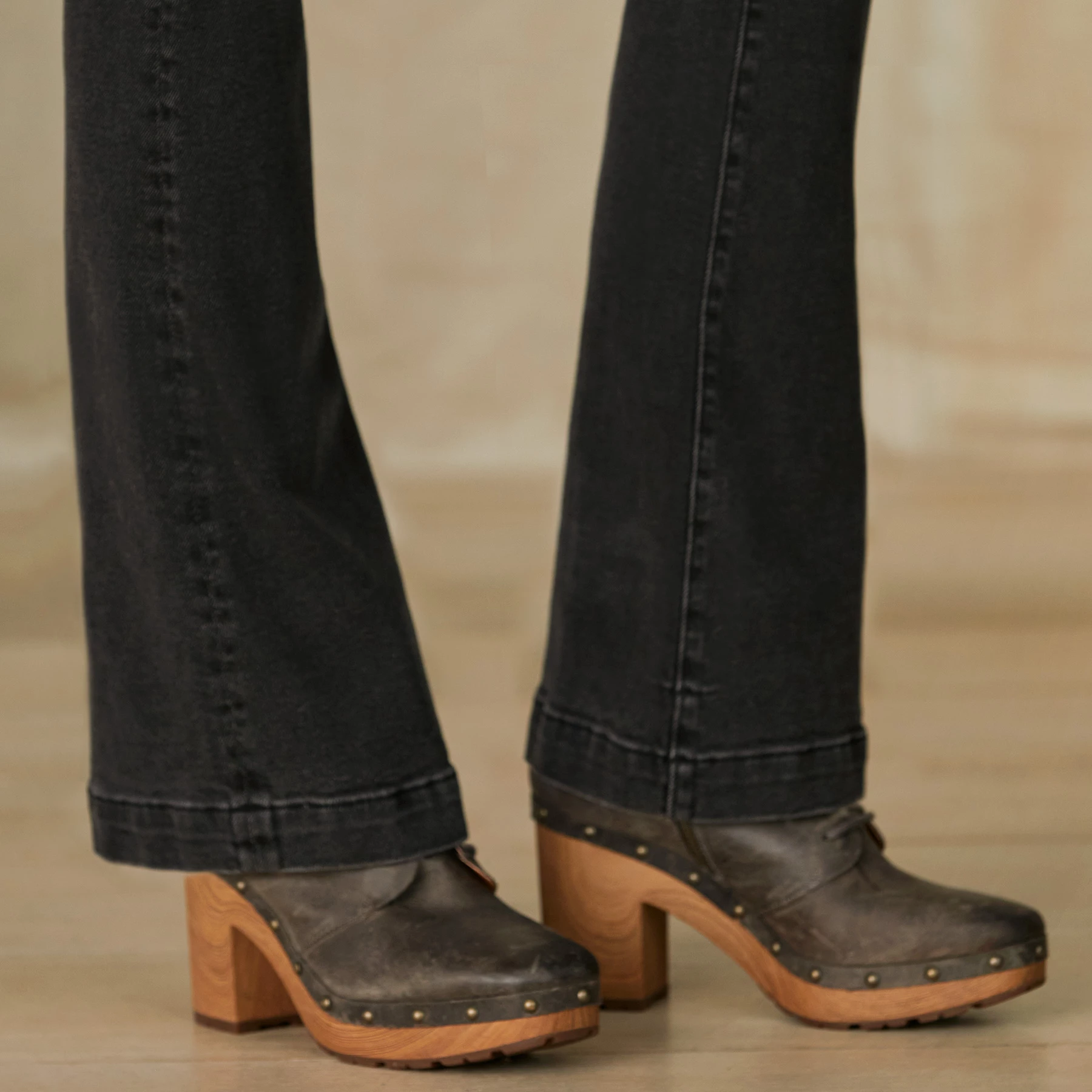 These dark wash jeans with just-right fading have a classic five-pocket styling with a zip fly and flare silhouette. Cotton/polyester/spandex. Machine wash. Imported. Exclusive. Sizes 24–34. 32″ inseam; 10″ rise; 17″ leg opening.